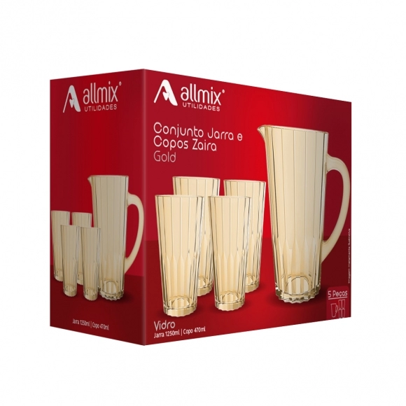 Produzidos em vidro Gold, a jarra de 1250ml é perfeita para servir sucos, água e drinks, enquanto os 4 copos de 470ml completam o conjunto com praticidade e elegância. O kit vem em luva com 5 unidades, pronto para venda ou presente, agregando valor e organização ao estoque.