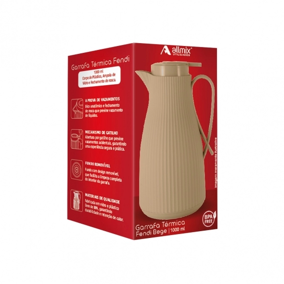 Este link contém: a Garrafa Térmica Fendi 1000 ml Bege, ideal para manter bebidas quentes ou frias com segurança, praticidade e estilo. Produzida em plástico resistente com ampola interna de vidro, tampa de rosca com anel de silicone e fechamento a vácuo, a garrafa possui bico anatômico que previne vazamentos e cabo de madeira com alça anatômica. O fundo antiderrapante proporciona maior segurança na superfície.