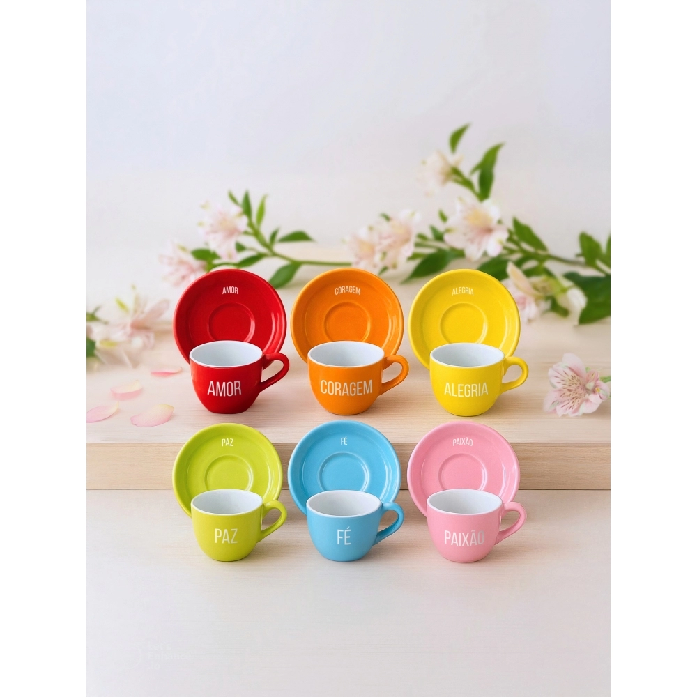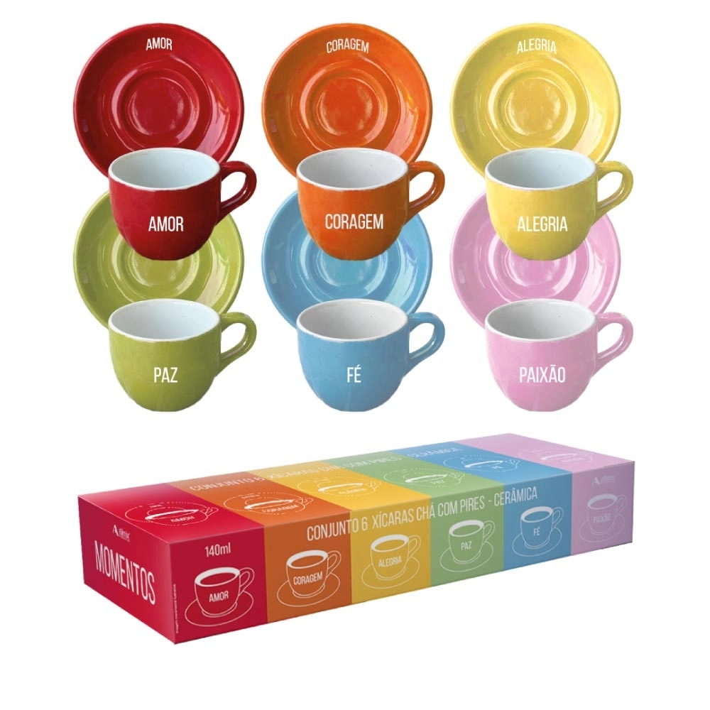 Este link contém: Jogo de xícaras de chá com pires em cerâmica Momentos Luva 140ml é perfeito para lojistas que desejam oferecer aos seus clientes um produto que une beleza, praticidade e qualidade artesanal. Com um design moderno e cores vibrantes, cada xícara com pires transmite alegria e aconchego, criando uma experiência diferenciada para momentos de pausa, cafés da tarde e encontros especiais.