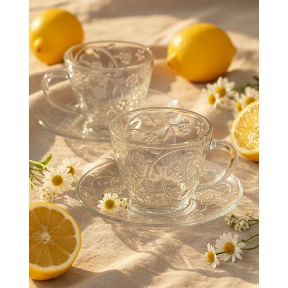 O pires de vidro acompanha o conjunto com harmonia e equilíbrio, completando o visual com um toque de sofisticação. Além de bonito, o conjunto é prático e resistente, podendo ser utilizado com segurança no micro-ondas e na lava-louças, sem perder o brilho e a transparência.