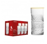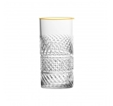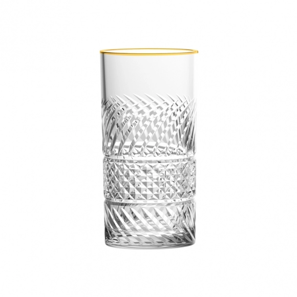 Fabricado em vidro de alta qualidade, o copo possui dimensões de 7,5 x 7,5 x 15 cm e capacidade ideal para long drinks, coquetéis, sucos, água saborizada, refrigerantes e bebidas refrescantes. Seu grande diferencial está no filete dourado aplicado manualmente, que adiciona brilho elegante, acabamento refinado e um toque artesanal que valoriza a peça e a experiência do cliente.