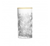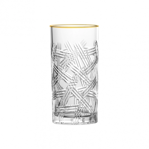 Fabricado em vidro de alta qualidade, o copo possui dimensões de 7,5 x 7,5 x 15 cm e capacidade de 390ml, ideal para servir long drinks, coquetéis, sucos, refrigerantes, água aromatizada e bebidas refrescantes com apresentação impecável. O destaque absoluto desta peça é o filete dourado aplicado manualmente, que traz brilho elegante, requinte e um toque artesanal que valoriza o acabamento premium.