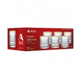 A transparência cristalina do vidro realça a apresentação das bebidas, enquanto o acabamento dourado adiciona brilho e requinte ao conjunto. O produto acompanha luva resistente com medidas de 25,3 x 10,5 x 17 cm, facilitando organização, proteção e exposição no PDV, tornando-se uma excelente opção para revendedores que buscam peças premium para compor linhas especiais de mesa posta.