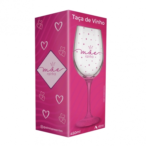 Fabricada em vidro e com capacidade de 450ml, possui tamanho ideal para servir diferentes tipos de vinho, permitindo uma experiência agradável e elegante na hora de degustar a bebida. Seu design clássico aliado à frase “Mãe Rainha” cria um produto que transmite carinho e reconhecimento, características que aumentam o poder de atração no ponto de venda.