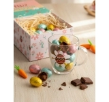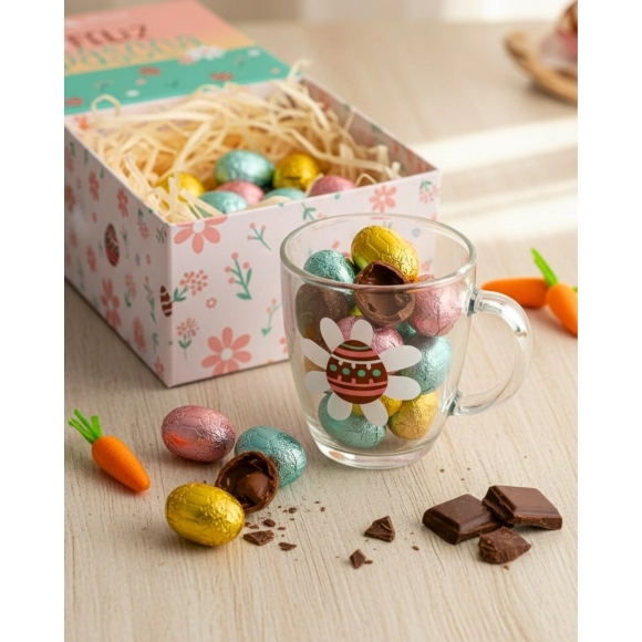 Com estampa ilustrativa de ovos de Páscoa, essa versão possui identidade visual mais clássica e comercial, ideal para públicos amplos. Seu design cônico em vidro transparente valoriza o produto tanto vazio quanto compondo kits personalizados.