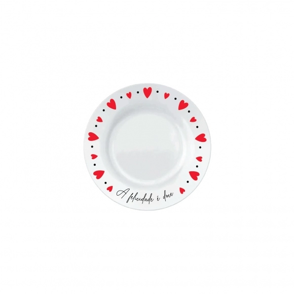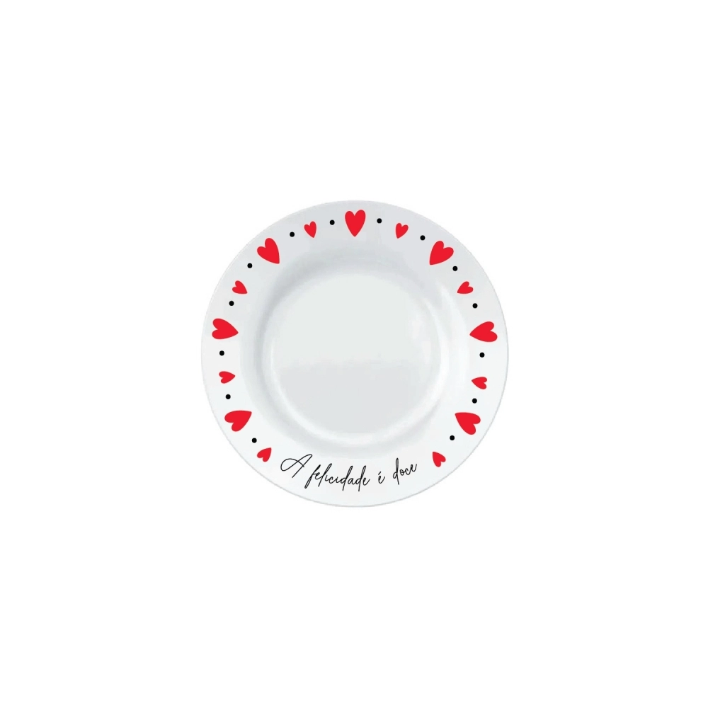 Com a Coleção Love, o amor é celebrado todo dia! Possui design exclusivo e apaixonante! Produto produzido em vidro na cor branco e borda decorada corações e os dizeres "A Felicidade é doce". Ideal para servir bolos e sobremesas.