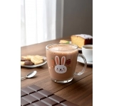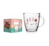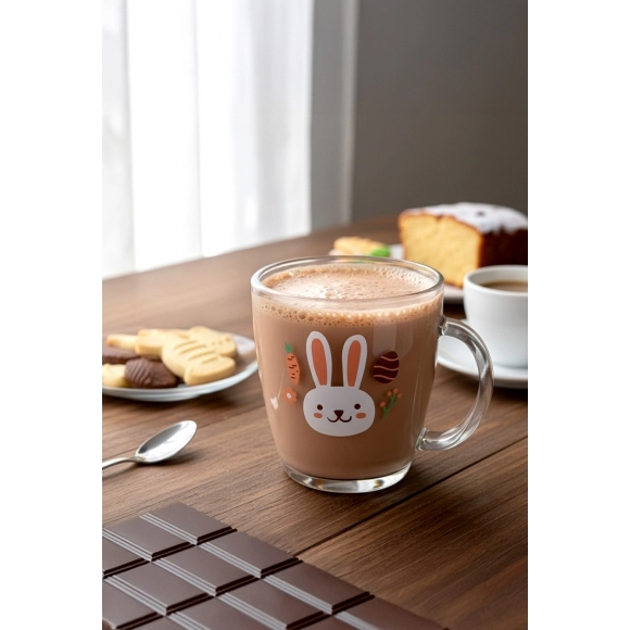 Com estampa delicada de coelho e design moderno em formato cônico, possui capacidade de 350ml e é fabricada em vidro resistente, ideal para servir café, chocolate quente, leite, sucos ou bebidas geladas. Acompanha luva com 1 unidade, proporcionando melhor apresentação no ponto de venda.