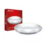 Fabricados em vidro transparente de alta qualidade, os pratos destacam a apresentação de sobremesas como bolos, tortas, pavês, doces finos e frutas. O acabamento com filete dourado transforma cada prato em um elemento decorativo que valoriza ainda mais a mesa.