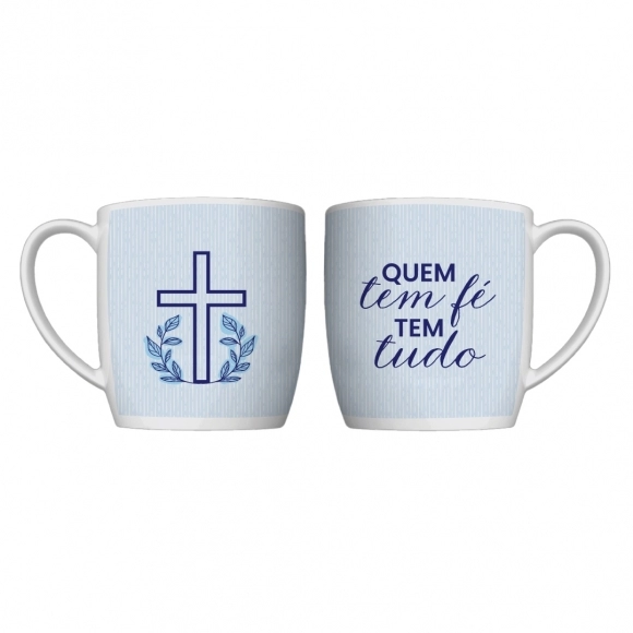 Produzida em porcelada com estampa "Quem tem fé, tem tudo!". Possui 360ml, ideal para servir bebidas quentes. Contém embalagem personalizada, sendo uma excelente opção para presentes.