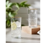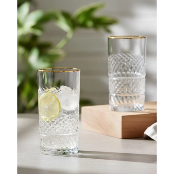 Fabricado em vidro de alta qualidade, o copo possui dimensões de 7,5 x 7,5 x 15 cm e capacidade ideal para long drinks, coquetéis, sucos, água saborizada, refrigerantes e bebidas refrescantes. Seu grande diferencial está no filete dourado aplicado manualmente, que adiciona brilho elegante, acabamento refinado e um toque artesanal que valoriza a peça e a experiência do cliente.
