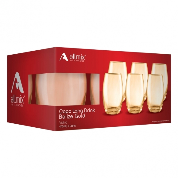 Este link contém: o Copo de Vidro Long Drink Belize Gold 470 ml Allmix, uma versão sofisticada e elegante do clássico copo long drink, ideal para elevar a apresentação de bebidas com um toque premium. Com acabamento diferenciado na linha Gold, é perfeito para bares, restaurantes, hotéis, eventos, utilidades domésticas e revendedores B2B que buscam produtos com maior valor agregado e apelo visual.