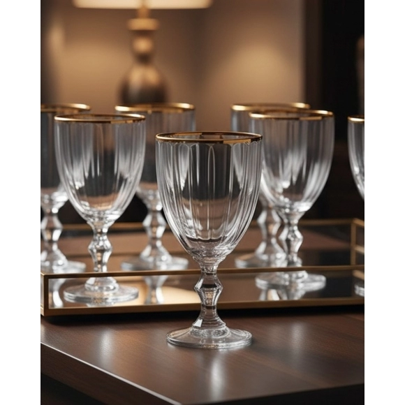 Este link contém: a Taça de Água de Vidro Filete Dourado Lines 320ml, uma peça sofisticada e charmosa que une luxo, elegância e qualidade em um único produto. Com acabamento superior e detalhe em filete dourado na borda, essa taça é perfeita para quem deseja oferecer requinte e exclusividade em mesas postas e ambientes gastronômicos refinados.