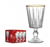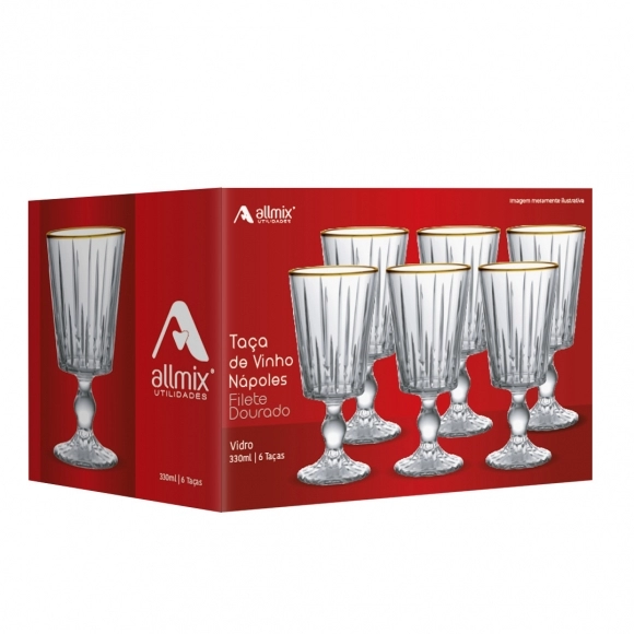 Este link contém: a Taça de Vinho de Vidro Filete Dourado Nápoles 330ml Allmix, uma peça sofisticada e atemporal que combina design refinado, brilho e acabamento artesanal, ideal para bares, restaurantes, hotéis, buffets, supermercados e lojas de utilidades domésticas que valorizam elegância e exclusividade em seus produtos.