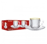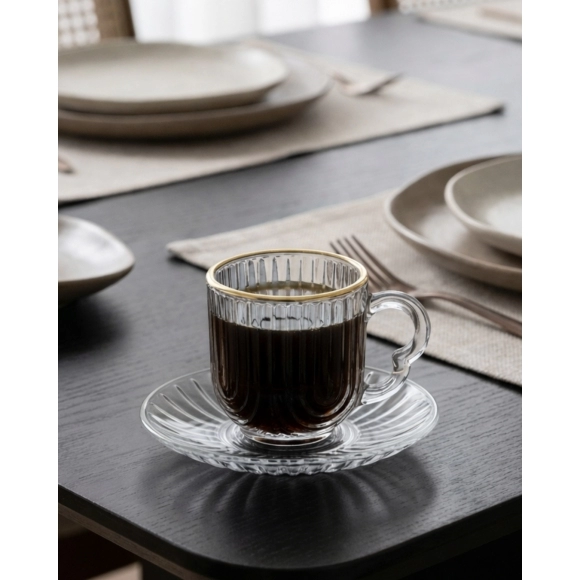 A xícara de café de vidro Laure com filete dourado 80ml e pires combina elegância e sofisticação para momentos especiais de café. O detalhe em borda dourada valoriza a peça e transforma o conjunto em uma excelente opção para compor mesas postas refinadas.