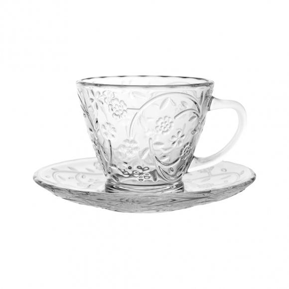 O pires de vidro acompanha o conjunto com harmonia e equilíbrio, completando o visual com um toque de sofisticação. Além de bonito, o conjunto é prático e resistente, podendo ser utilizado com segurança no micro-ondas e na lava-louças, sem perder o brilho e a transparência.